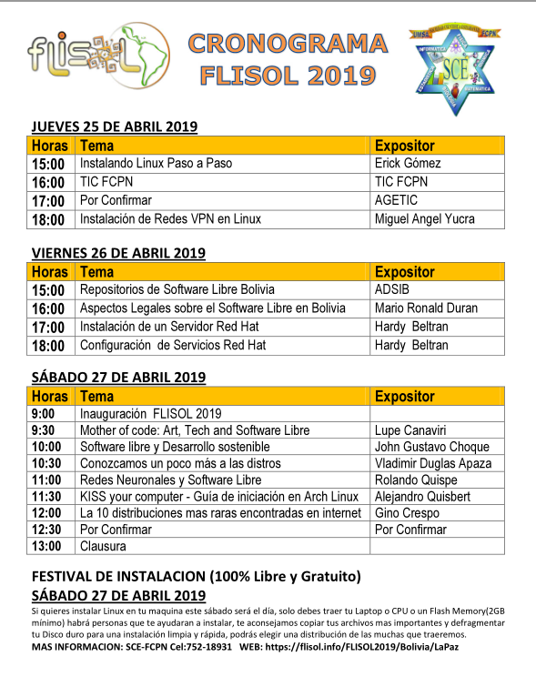 Además, durante el evento puedes llevar tu máquina portátil y te ayudaremos a probar e instalar software libre. Tendremos mucho software (legal, y para Windows y Mac también) para que puedas descargarlo o llevarte una copia y tendremos personas experimentadas para ayudarte a completar el proceso. En los días antes del evento (y el sábado también) tendremos expositores que darán charlas sobre su experiencia con el software libre. Se hablará de instalación de servidores, experiencias con distribuciones empresariales y el estado del software libre en Bolivia, entre otras más cosas.