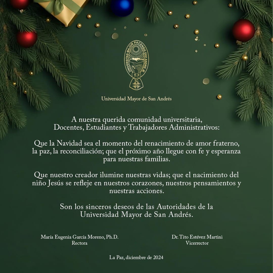 La Universidad Mayor de San Andrés (UMSA) desea expresar sus más sinceros deseos de paz, amor y prosperidad a toda la comunidad universitaria y a la sociedad boliviana en esta época especial del año.
